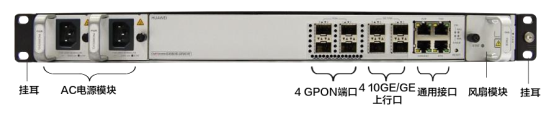 本产品为盒式 OLT,内置主控业务模块,配置 1 个可拔插风扇模块和 2 块可拔插 AC 电源模块,可以适配 IEC 规格和 ETSI 两种规格的挂耳,用于固定在不同规格的机架或者机柜中。