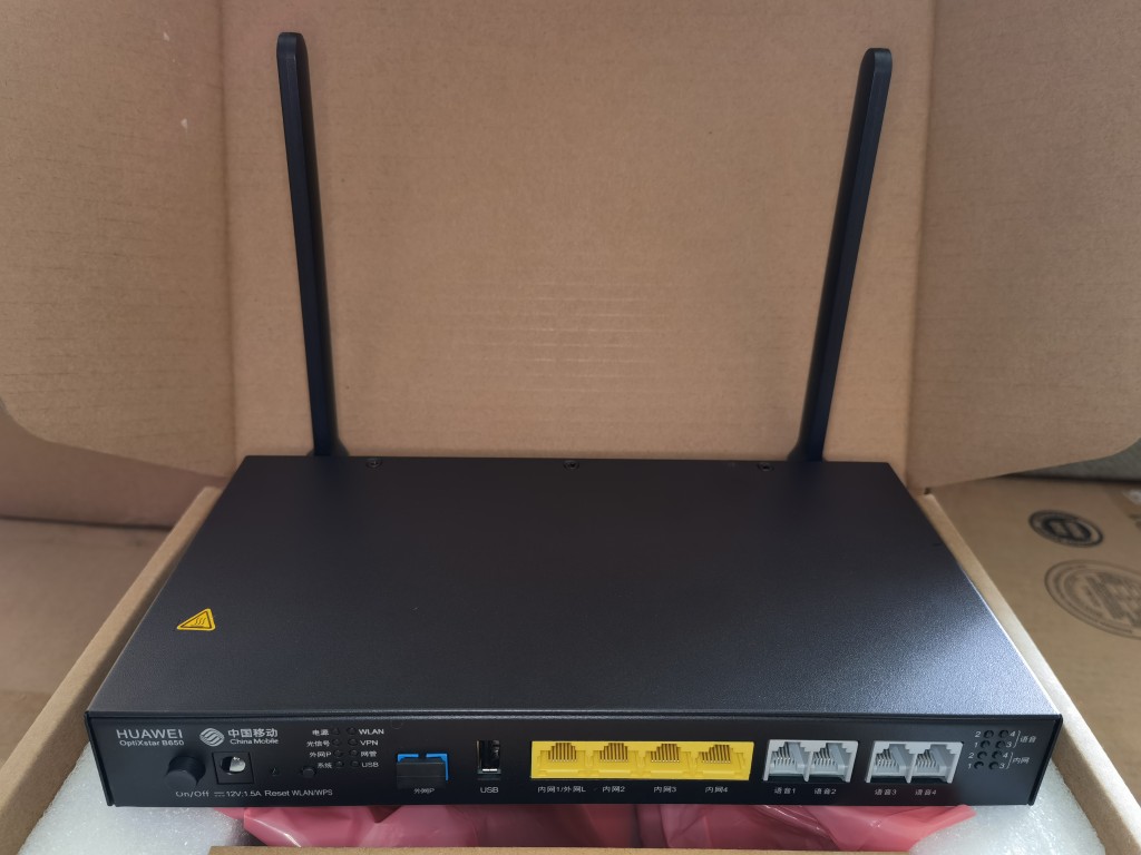 Desc.; B650-S1-4E4P2W,Multi-service Access Equipment,compact,GPON Uplink(sc UPC),4GE+4POTS+2*2 2.4GWIFI+2*2 5G WIFI+1 USB2.0 ACWith Wall mounted Power Adapters(With Power Cable).For China Mobile