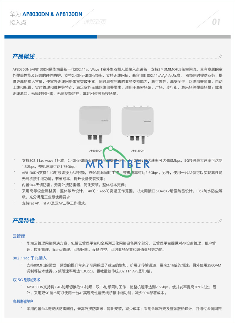 AP8030DN&8130DN是华为公司推出的技术引领级室外802.11ac产品,防尘防水,耐高低温。