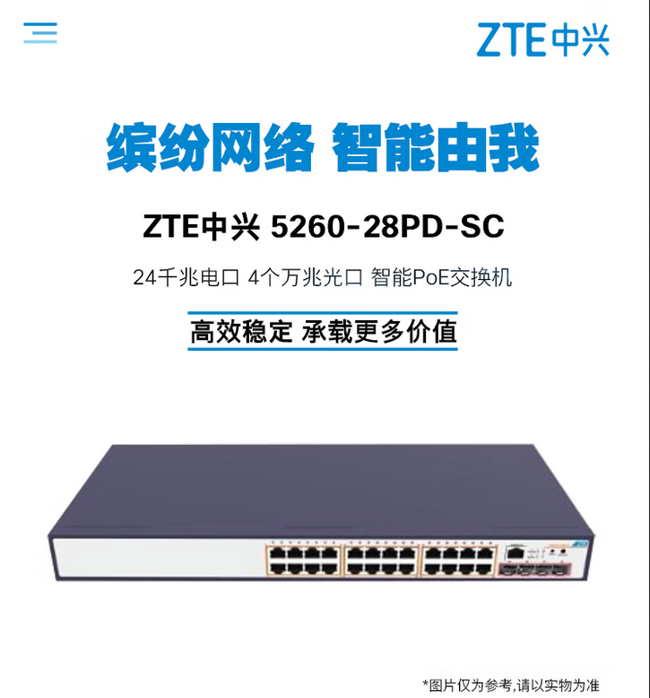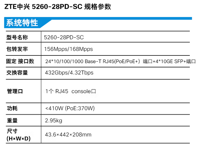 ZXR10 5260-28PD-SC 24千兆电口(支持POE+,单端口最大输出功率30瓦),4个万兆光口(可降速到千兆),固定交流电源