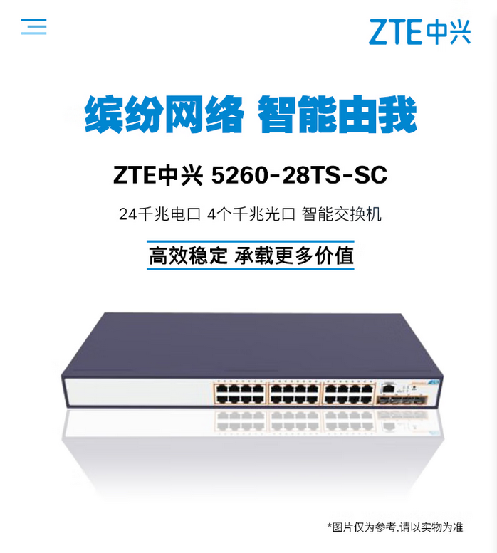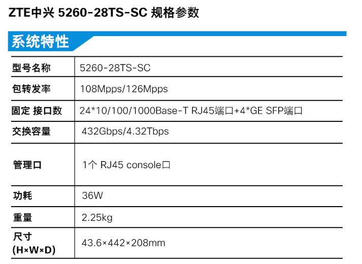 ZXR10 5260-28TS-SC,中兴交换机,24千兆交换机,24千兆电口,4个千兆光口,固定电源,无风扇