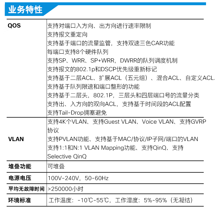 支持 IEEE 802.1p (COS), IEEE 802.1q (VLAN), IEEE 802.3x 支持 IEEE 802.1d (STP)/ 802.1w (RSTP)/ 802.1s (MSTP)/EVST 支持 IEEE 802.3ad (LACP), 静态聚合 支持 IEEE 802.3u(100Base-T)/802.3z (1000Base-X) / 802.3ab (1000BaseT) 支持 IEEE 802.3ae (10Gbase) 支持基于端口的 VLAN, 基于MAC的 VLAN, Voice VLAN 支持 QinQ, 灵活 QinQ 支持 PVLAN 支持 端口镜像,流镜像 支持 GVRP 支持 LLDP 支持 UDLD 支持 MAC地址绑定 支持 MAC 过滤 和动态MAC学习 支持 广播风暴抑制 支持 线路诊断分析和测试 支持端口环回检测 支持 MFF |
